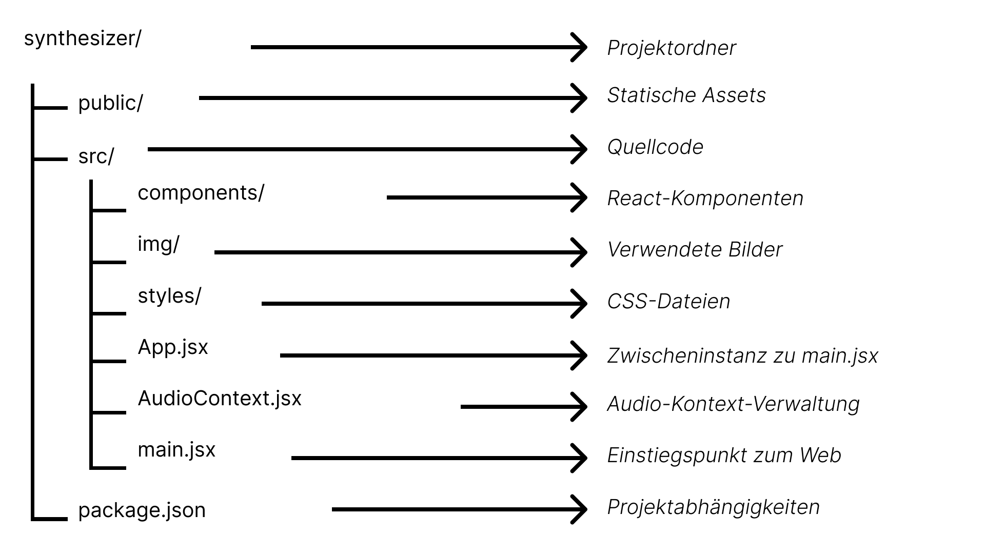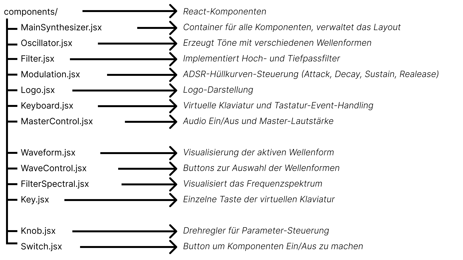 Technisch basiert Wave Lab auf der Web Audio API in Kombination mit React. Zwei Oszillatoren liefern das Ausgangssignal, das durch ADSR-Hüllkurven, Hoch- und Tiefpassfilter sowie individuelle Lautstärkeregelung weitergeformt wird. Die gesamte Signalverarbeitung passiert dabei direkt im Browser – ohne externe Software oder Plug-ins.